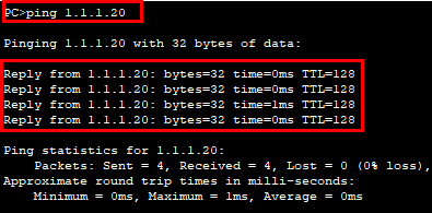 2) 1.1.1.3 PC에서 1.1.1.20 으로 Ping 테스트(VLAN 20)