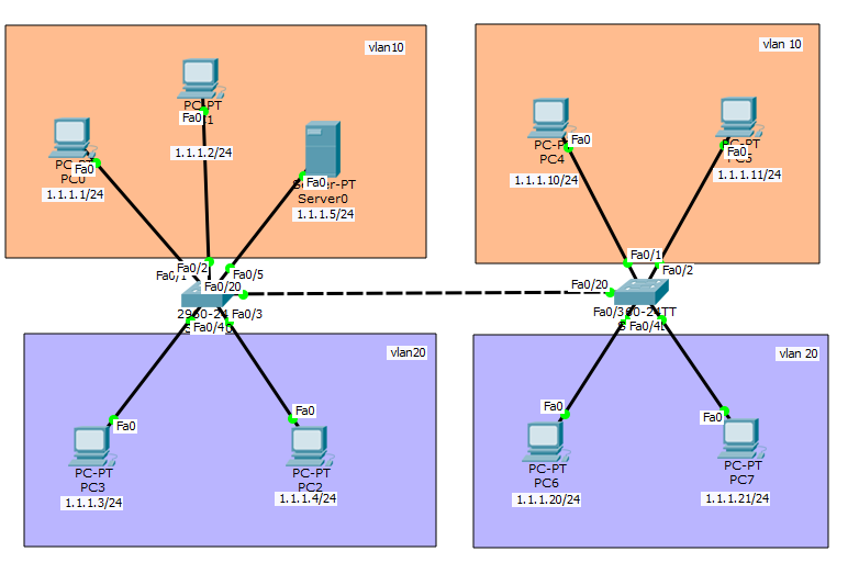 - Switch 2개가 FastEthernet 0/20 으로 서로 연결되어있다.