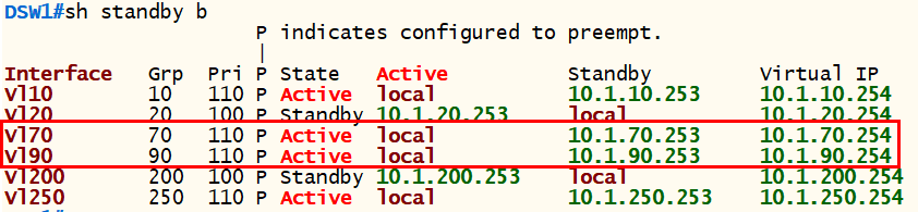 - VLAN 70, 90번을 HSRP로 구성하여 DSW1에는 Active DSW2에는 Standby 상태로 구성한다.