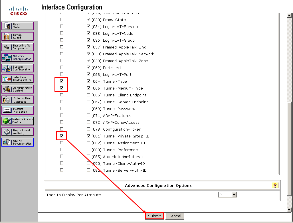 - NAD VLAN 90번 IP로 설정하고 RADIUS (IETE)로 설정 후 Submit버튼을 클릭한다.