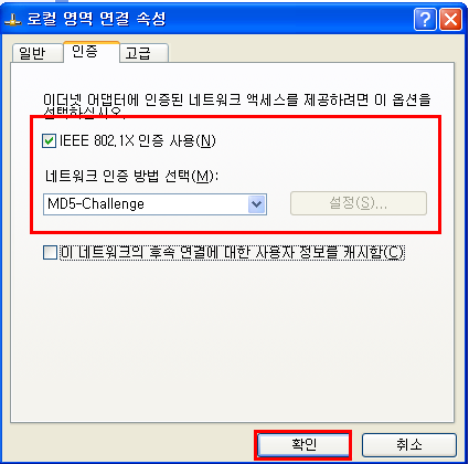 - 인증에서 IEEE 802.1X인증을 사용하고 인증 방식을 MD5-Challenge(CHAP) 방식을 선택한다.