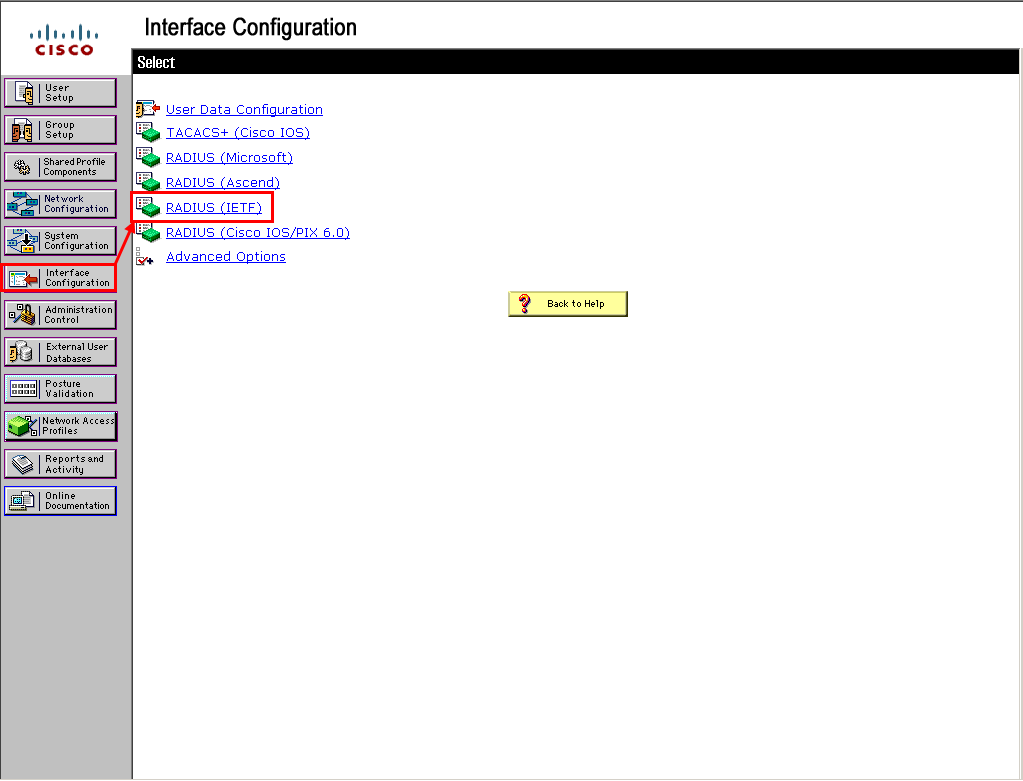 - Interface Configuration 메뉴에서 RADIUS (IETE)를 클릭한다.