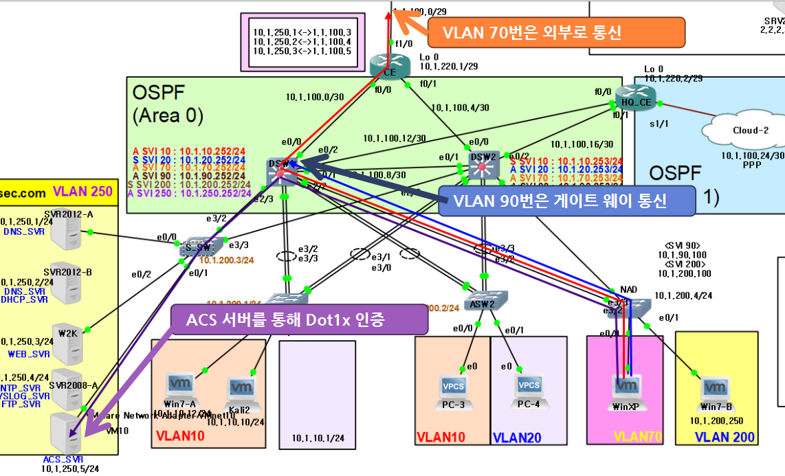- NAD 스위치는 ACS인증서버(Vlan 250)와 통신이 가능해야 Dot1x 인증처리를 수행할 수 있다.