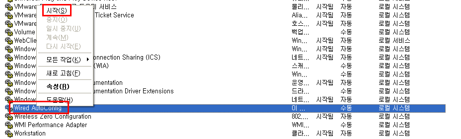 - Wired AutoConfig를 시작하고 속성에 들어가서 자동으로 설정하여 부팅 시마다 서비스가 실행되도록 설정한다.