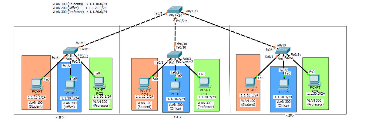 - 1F에 교실(VLAN 100) , 행정실(VLAN200), 교수실(VLAN300)으로 구성되어있다.