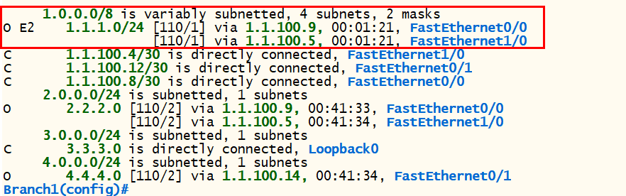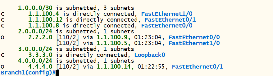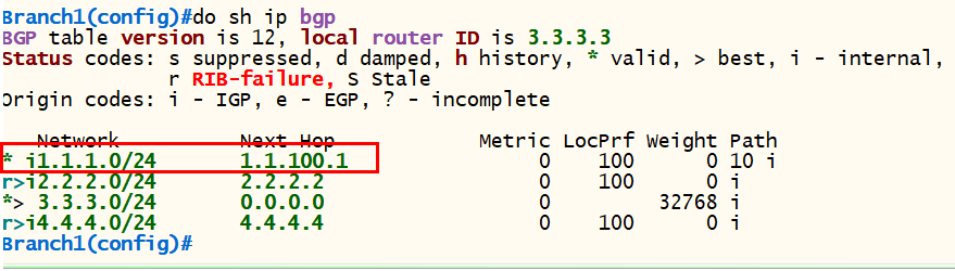 - 하지만 Branch1 라우터의 라우팅 정보를 확인해 보면 1.1.100.1 경로 정보가 Routing Table에 등록되어 있지 않아서 Best Path(>)로 등록되지 못한다.