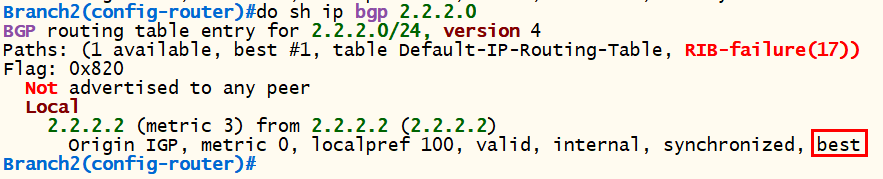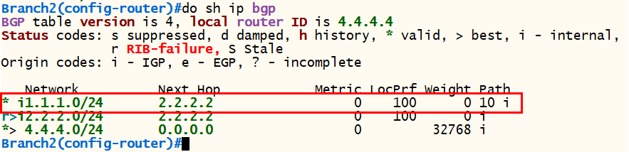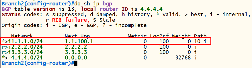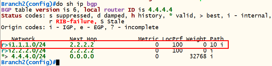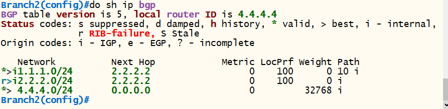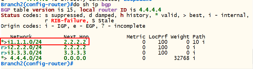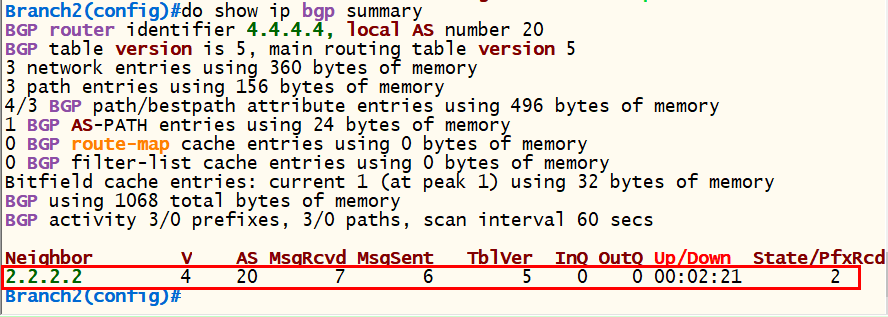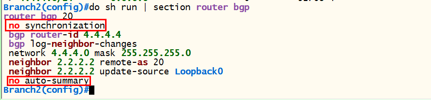 <Branch2> conf t router bgp 20 bgp router-id 4.4.4.4 neighbor 2.2.2.2 remote-as 20 neighbor 2.2.2.2 update-source loopback 0 network 4.4.4.0 mask 255.255.255.0 exit |