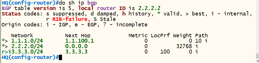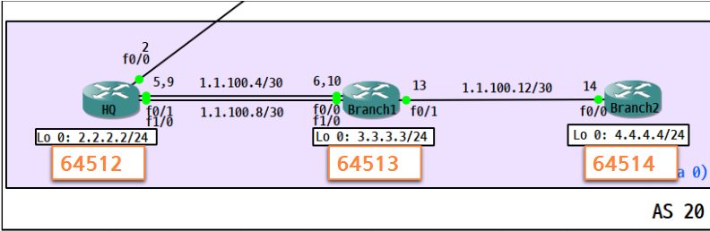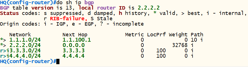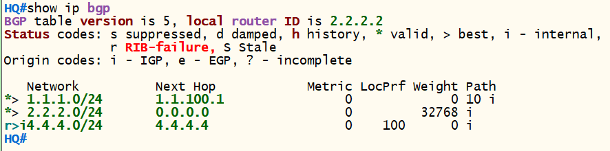 <HQ> conf t router bgp 20 bgp router-id 2.2.2.2 neighbor 1.1.100.1 remote-as 10 neighbor 4.4.4.4 remote-as 20 neighbor 4.4.4.4 update-source loopback 0 neighbor 4.4.4.4 next-hop-self network 2.2.2.0 mask 255.255.255.0 exit
