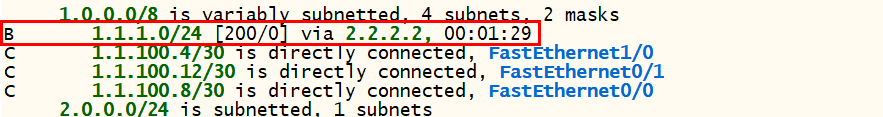 - 라우팅 정보도 1.1.1.0으로 가는 정보가 2.2.2.2 BGP로 설정된 것을 확인할 수 있다.
