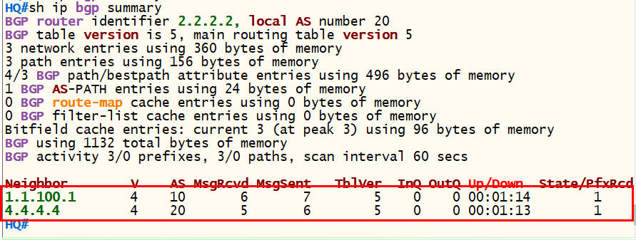 <HQ> conf t router bgp 20 neighbor 4.4.4.4 remote-as 20 neighbor 4.4.4.4 update-source loopback 0 exit
