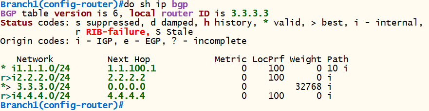 <Branch1> conf t router bgp 20 bgp router-id 3.3.3.3 neighbor 2.2.2.2 remote-as 20 neighbor 2.2.2.2 update-source loopback 0 neighbor 4.4.4.4 remote-as 20 neighbor 4.4.4.4 update-source loopback 0 network 3.3.3.0 mask 255.255.255.0 exit