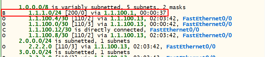 - bgp 정보를 확인해 보면 1.1.1.0/24에 대한 Next-Hop 주소가 1.1.100.1로 설정되어 있다.