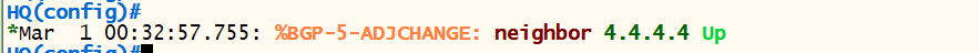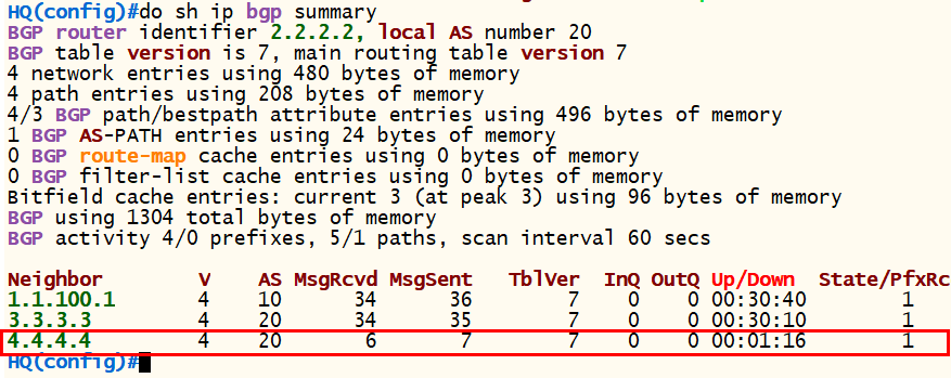 <HQ> conf t router bgp 20 no neighbor 4.4.4.4 remote-as 20
