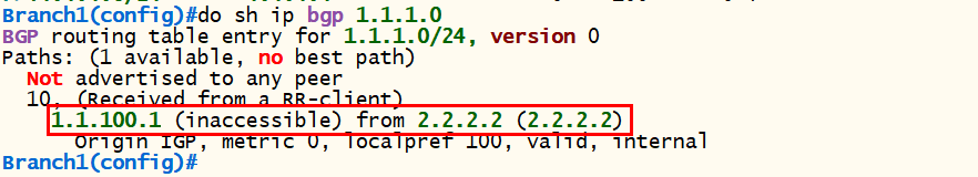 - Branch1번 에서는 모두 등록되어있지만 1.1.1.0에 Best Path(>)로 선택되어있지 않다. (Next-Hop 도달성 문제)