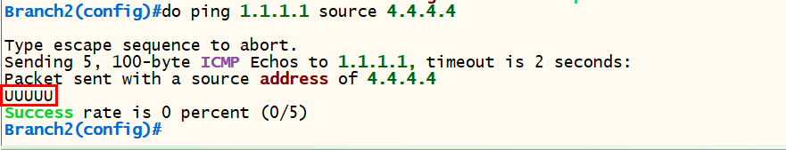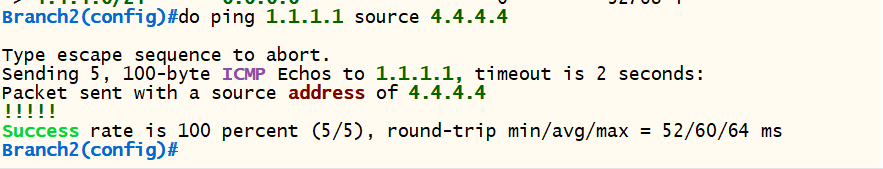 <Branch2> conf t ip route 1.1.100.1 255.255.255.255 fa 0/0 1.1.100.13 |