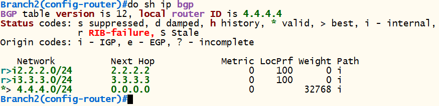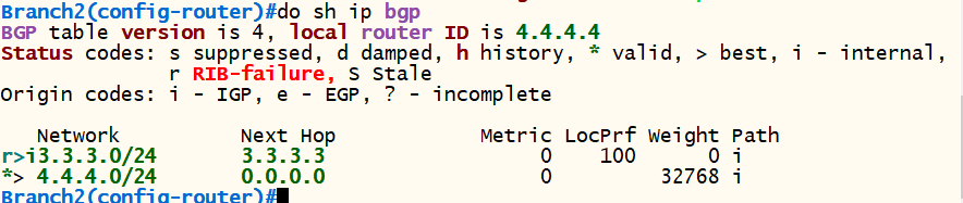 <Branch2> conf t router bgp 20 bgp router-id 3.3.3.3 neighbor 3.3.3.3 remote-as 20 neighbor 3.3.3.3 update-source loopback 0 network 4.4.4.0 mask 255.255.255.0 exit |