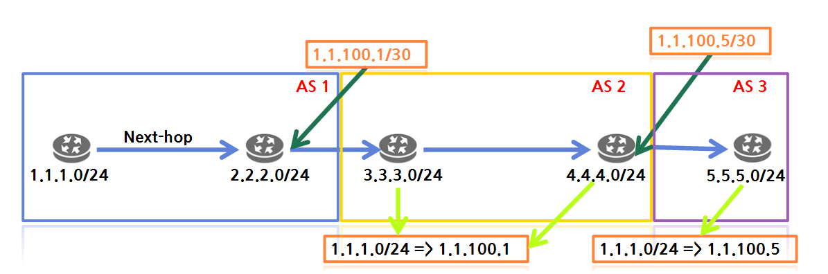 - BGP의 경우 동일 AS 안에서 특정 네트워크 정보를 광고하는 경우 해당 네트워크에 대한 Next-hop 주소가 변경되지 않는다. Next-Hop 주소가 변경되는 경우는 AS가 변경되는 경우이다.