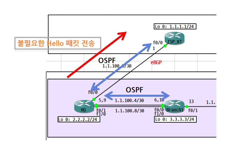 - 불필요한 Hello 패킷 전송을 막기 위해 passive-interface fa 0/0 입력