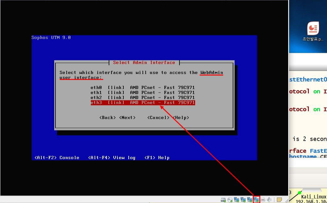 - 이전에 UTM 장비를 추가할 때 Network Adaptor 1~4번 항목을 Internal(VMnet7), DMZ(VMnet9), External(VMnet10), Management(VMnet11) 순서대로 지정을 했기 때문에 eth3번이 Management(VMnet11)로 설정되어 있다.