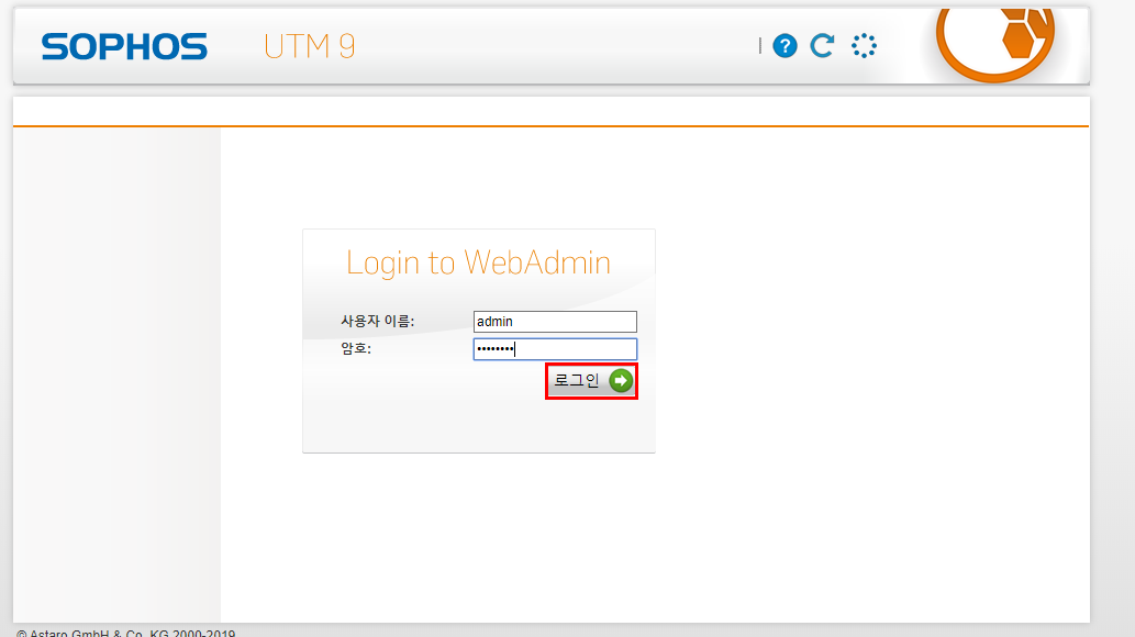- 아이디는 admin을 입력하고 바로 이전에서 설정한 비밀번호를 입력해서 UTM 장비에 로그인한다.