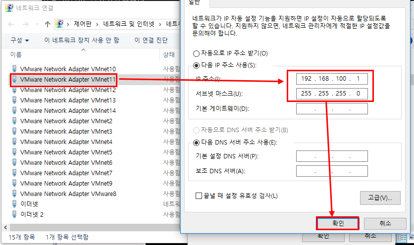 - Main OS에서 네트워크 설정을 들어간 이후 VMnet11번 IP 주소를 192.168.100.1로 변경한다.