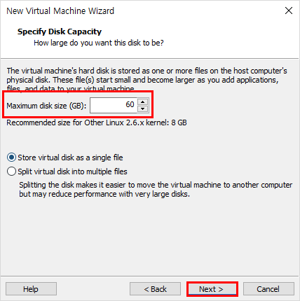 - 하드웨어 크기를 60GB로 설정한 후 다음 버튼을 클릭한다.