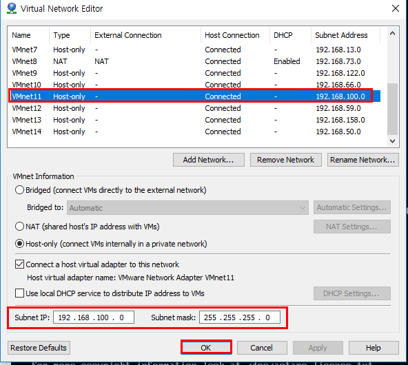 - VMnet11번 Subnet IP를 192.168.100.0으로 변경한다.