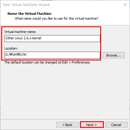 - Virtual machine name에서 가상 머신의 이름을 지정해주고 Location에서 가상 머신을 저장할 경로를 지정한 후 다음 버튼을 클릭한다.