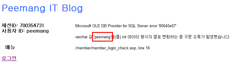 - 문자열과 숫자 데이터의 비교 연산은 형 변환 에러를 유발하며 문자열 데이터를 에러 메시지에 포함하게 된다.