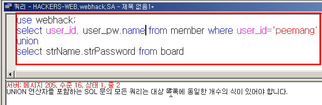 - UNION을 이용하여 mismatch를 발생시켜 Select 구문에 사용된 Field의 개수를 알아낼 수 있고 문자열 데이터의 경우 그 데이터를 알아낼 수 있다.