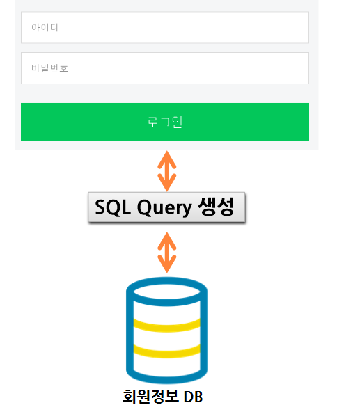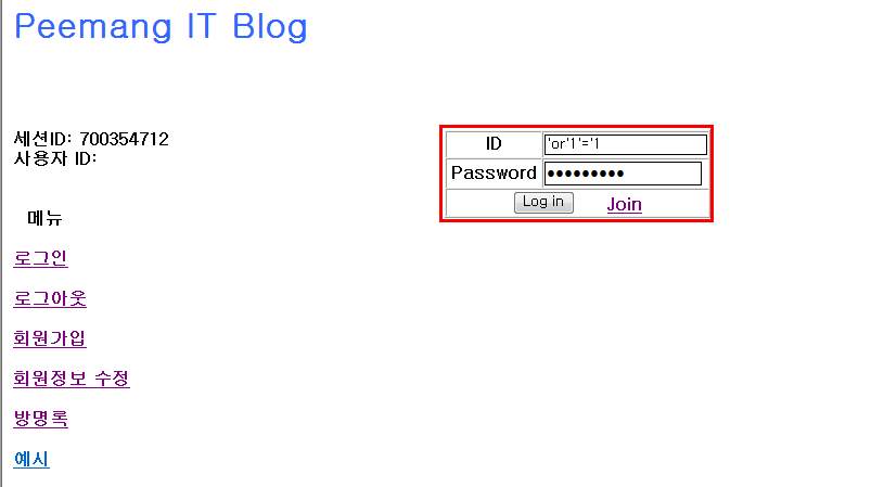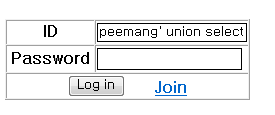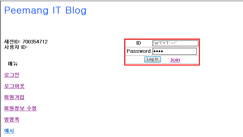 - query문을 이용하여 정상적인 사용자 ID와 패스워드를 입력하지 않고 로그인 인증을 하려고 한다.