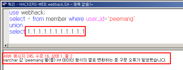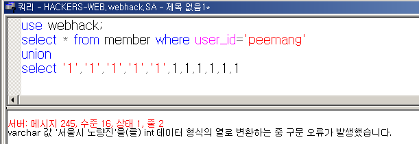 - 1을 1개씩 계속 대입하다 보면 Field값이 5개인 것을 확인할 수 있고 첫 번째 데이터(peemang)가 형 변환 오류가 발생한다.