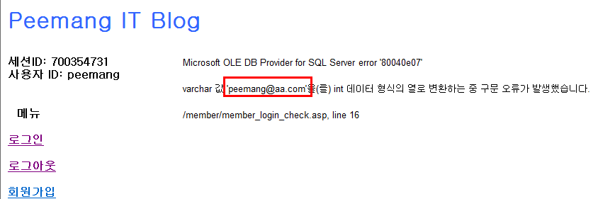 - 이 방법을 이용하면 user_pw를 문자 형식 데이터(varchar)인 user_pw를 정수형(int) 데이터인 1과 비교하면서 형 변환 에러가 발생한다.