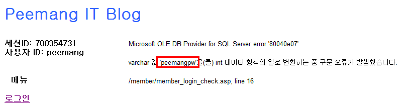 - 형 변환 오류가 발생하면서 사용자의 패스워드를 알아낼 수 있다.