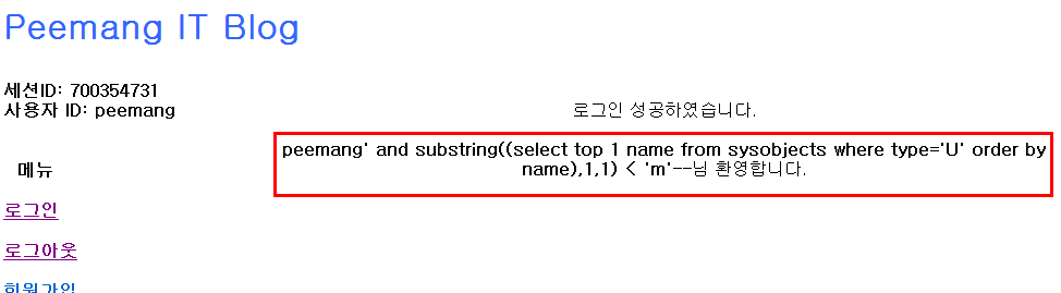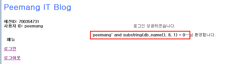 - 이 경우 substring()을 사용하여 문자열의 특정 문자열을 한 글자씩 찾아가는 Blind SQL Injection 공격을 시도해 볼 수 있다.