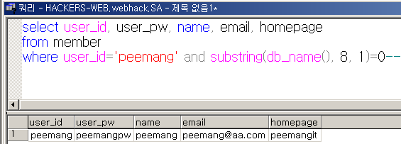 - 사용자 ID가 Peemang(True)이고 DB이름(Webhack)에 w가 들어가므로 peemang ID의 정보가 출력된다.