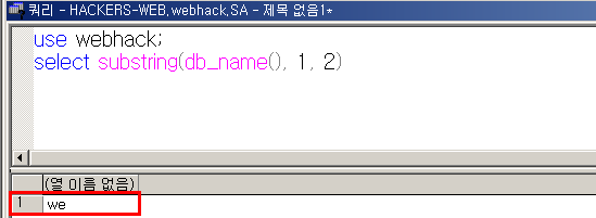 - webhack(db_name())이란 이름을 첫 번째 글자부터 2개의 문자를 자르므로 we가 출력된다.