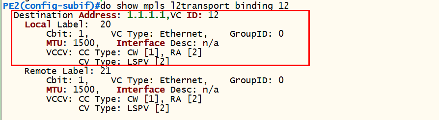 2.1) show mpls l2transport binding [VC 번호]