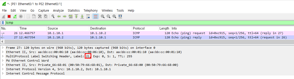 - PE1과 PE2 사이의 패킷을 Wireshark로 확인한다.