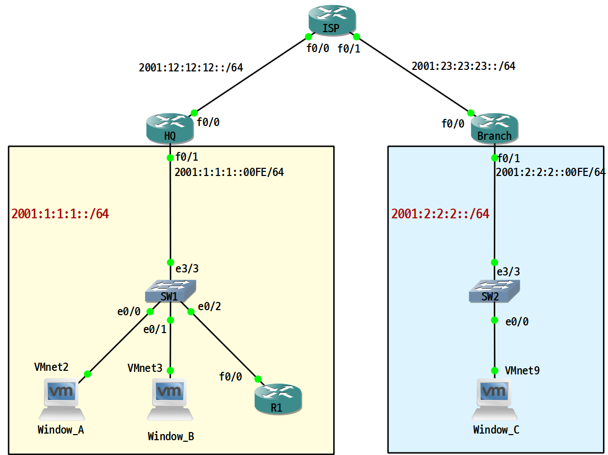 - HQ, ISP, Branch 라우터의 인터페이스를 IPv6로 설정한다.