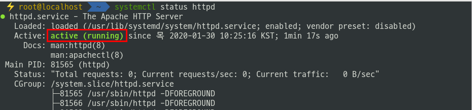 - 설치가 완료되었다면 httpd 서비스를 시작하고 재부팅 시 자동으로 시작될 수 있게 설정한다.