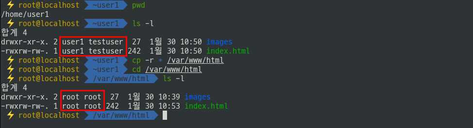 - 사용자 홈 디렉터리에 index.html과 images 디렉터리를 옮겨놓고 /var/www/html로 복사하면 소유자와 그룹이 변경된 것을 확인할 수 있다.