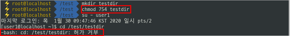 - 디렉터리에 실행 권한이 없다면 해당 디렉터리 내부 파일들에 접근이 불가능하다.