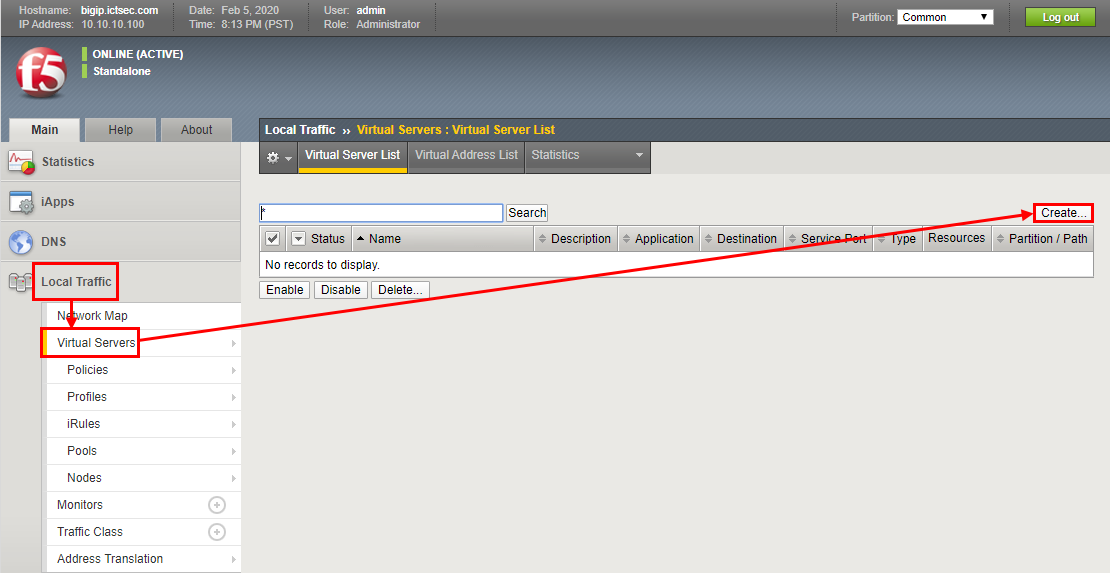 - Virtual Server를 생성하기 위해서 Local Traffic→ Virtual Servers → Create를 클릭한다.