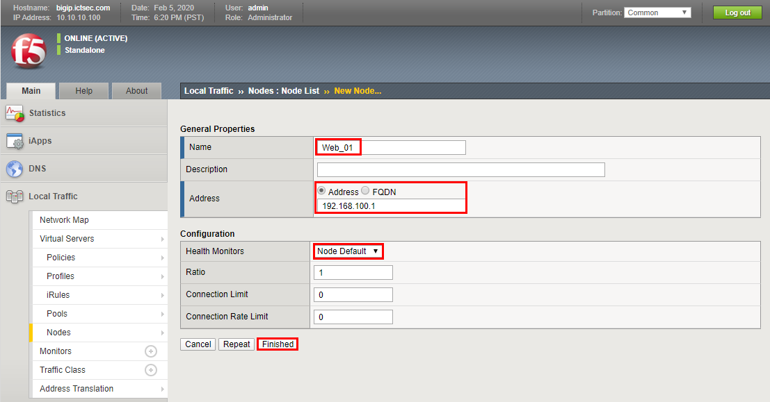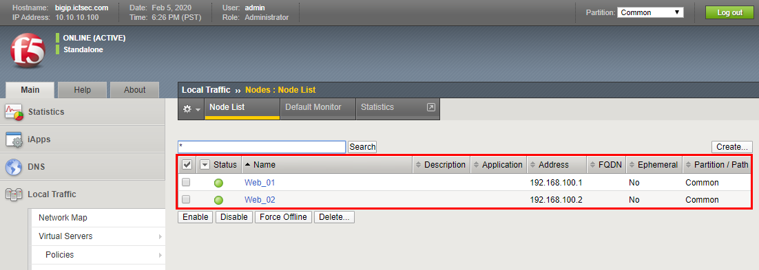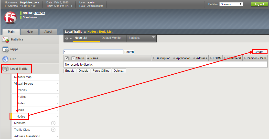 - Node를 등록하기 위해서 Local Traffic → Nodes → Creat를 클릭한다.