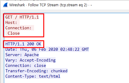 - TCP Stream을 확인해보면 사용자가 정의한 GET 메시지를 보내고 200 OK응답을 받는것을 확인할 수 있다.