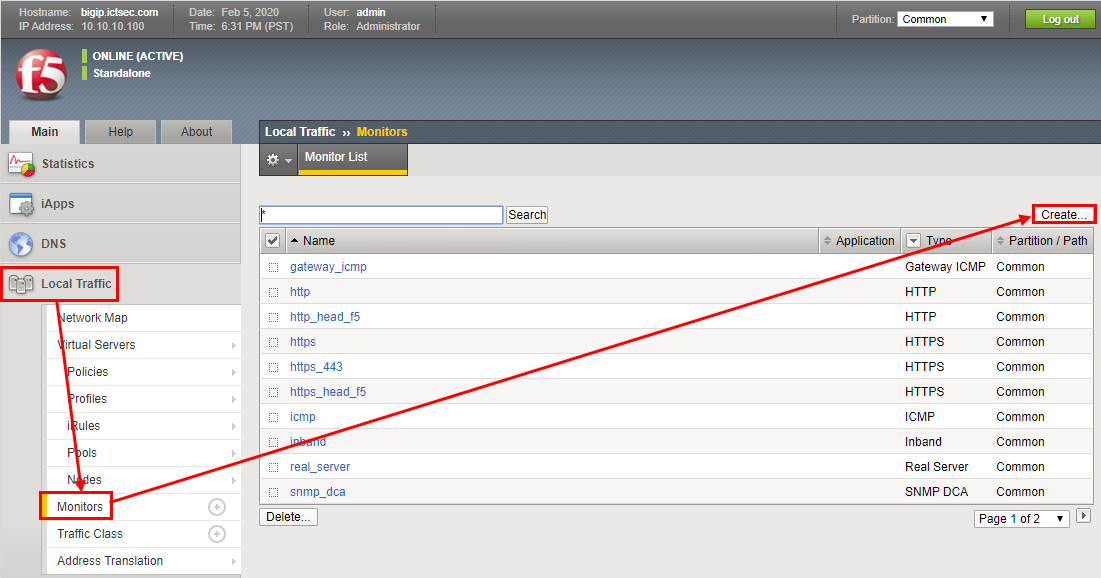 - Local Traffic → Monitors → Create를 클릭한다.