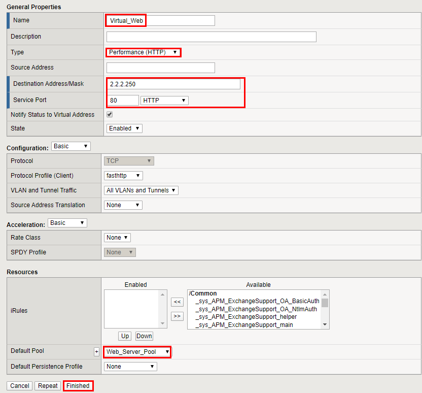 - Virtual Server IP 주소를 2.2.2.250 서비스 포트를 HTTP(80)으로 지정한다.