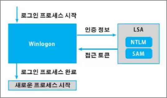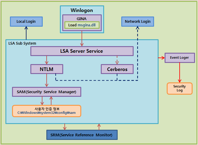 로그인 후 LSA 서브 시스템이 로컬 도메인 인증용인지 확인 후 SAM에 의해 인증을 수행한다.