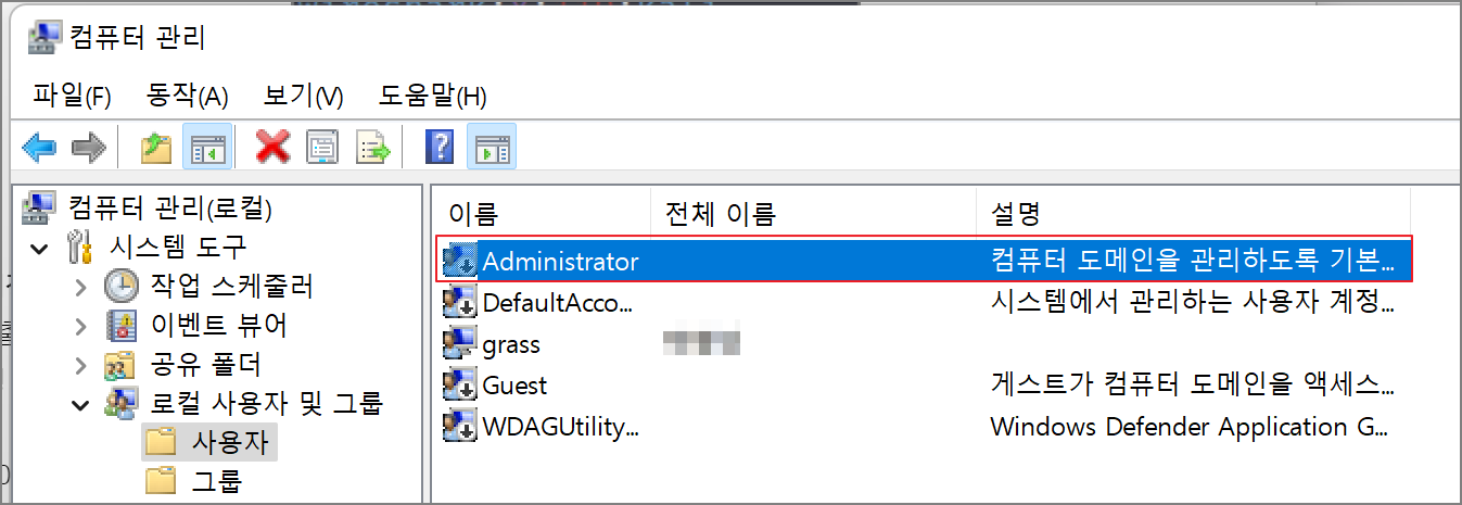 compmgmt.msc → 로컬 사용자 및 그룹 → 사용자